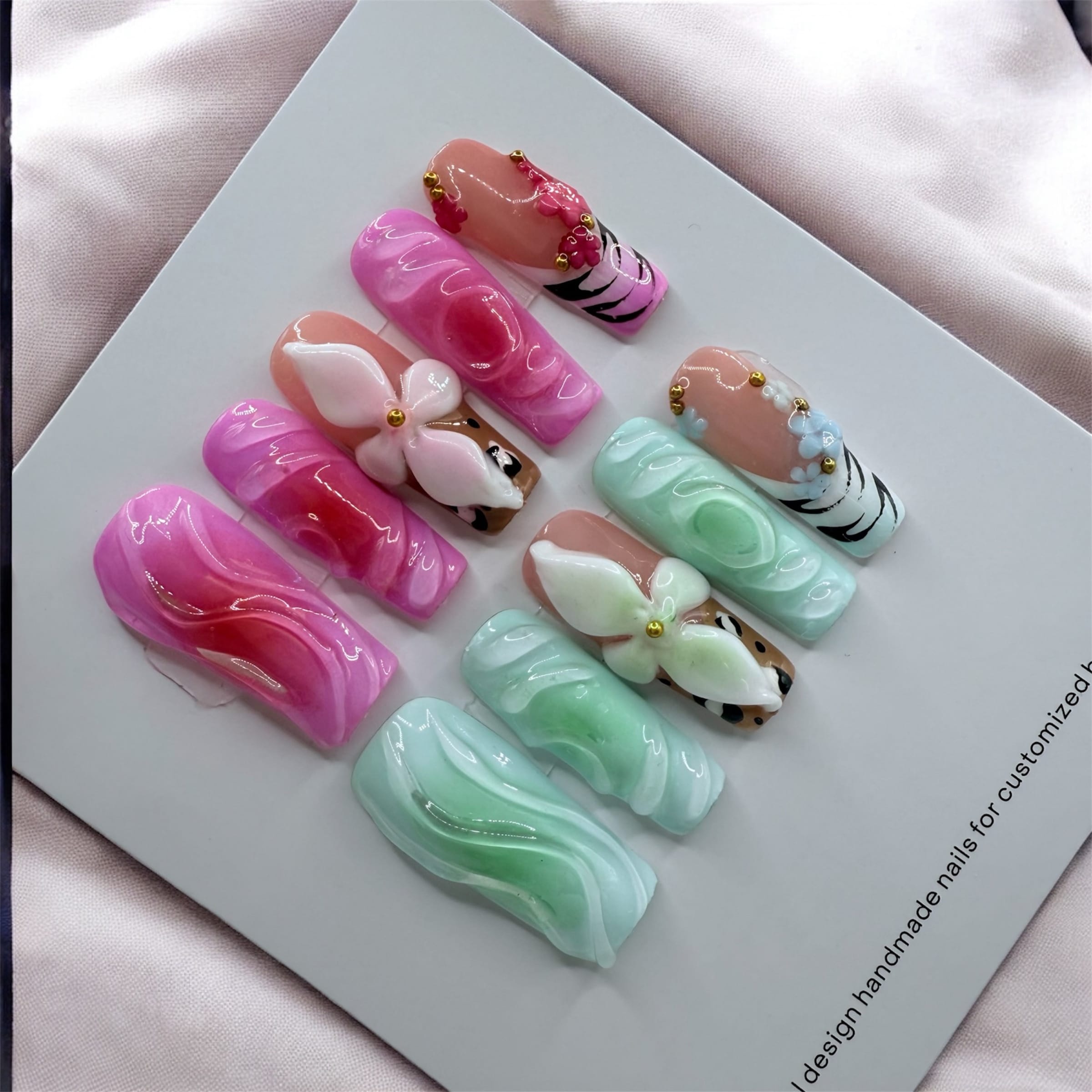 These are the best press-ons I've tried! The fit was perfect and the floral design is flawless. They stayed on securely for my entire vacation but came off without any damage. 10/10!