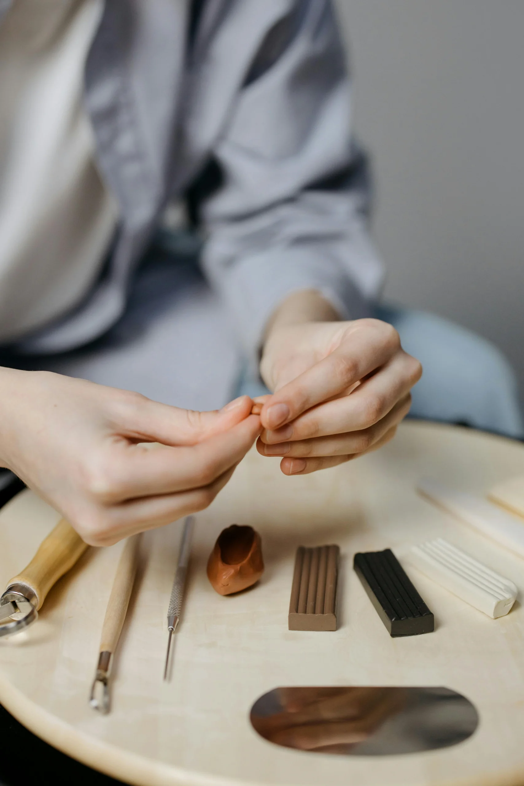 You do not need a professional studio to start working with polymer clay. All you need are some basic tools: a blade for cutting, rollers for flattening, molds if you want uniform shapes, and a smooth surface to work on. Before starting, condition the clay by kneading it thoroughly to make it soft and pliable.