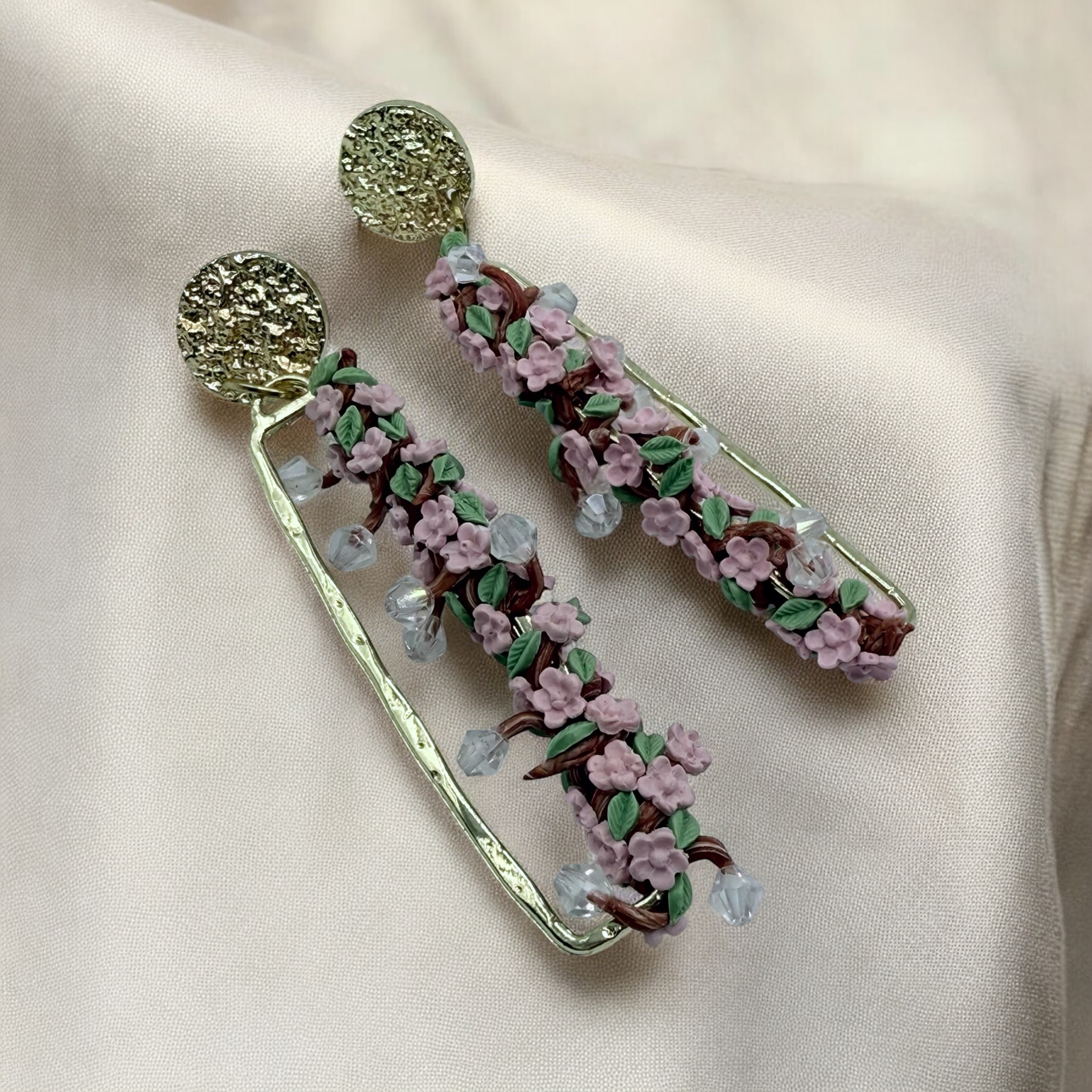 Vine on long hoops with tiny pink flowers complemented by glass beads. These earrings are very intricate and unique yet