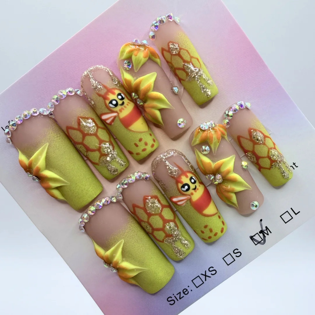 Bee Floral Square Press On Nails are a whimsical, nature-inspired work of art that brings the beauty of the garden straight to your fingertips. This extraordinary handcrafted set combines hand-painted bee and insect designs, intricate 3D floral details, honeycomb-inspired accents, and sparkling rhinestone embellishments — all finished in a smooth matte top coat across a vibrant palette of lime green, sunny yellow, and warm orange. Playful, artistic, and utterly one-of-a-kind.